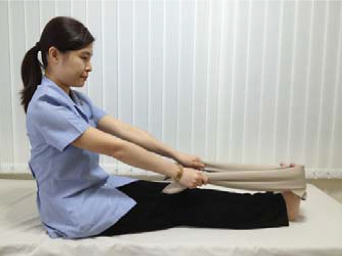 ท่าที่ 2: ผู้ป่วยนั่งเหยียดขาข้างที่ต้องการยึดเอ็นร้อยหวาย ใช้ผ้าคล้องที่ปลายเท้าไว้แล้วดึงเข้าหาตัวจนรู้สึกว่าน่อง ด้านหลังตึง ทําค้างไว้นับ 1 – 10 ถือเป็น 1 ครั้ง ทําชุดละ 10 ครั้ง อย่างน้อยวันละ 3-5 ชุด